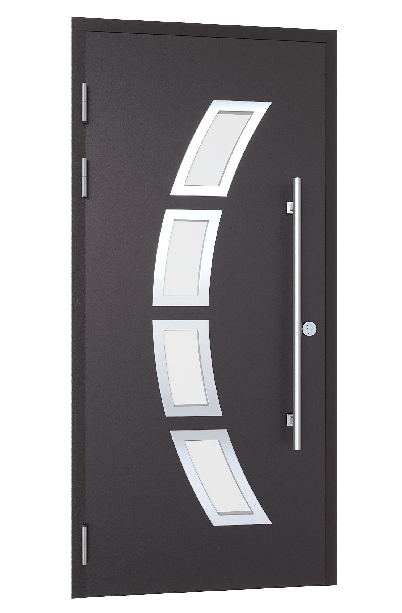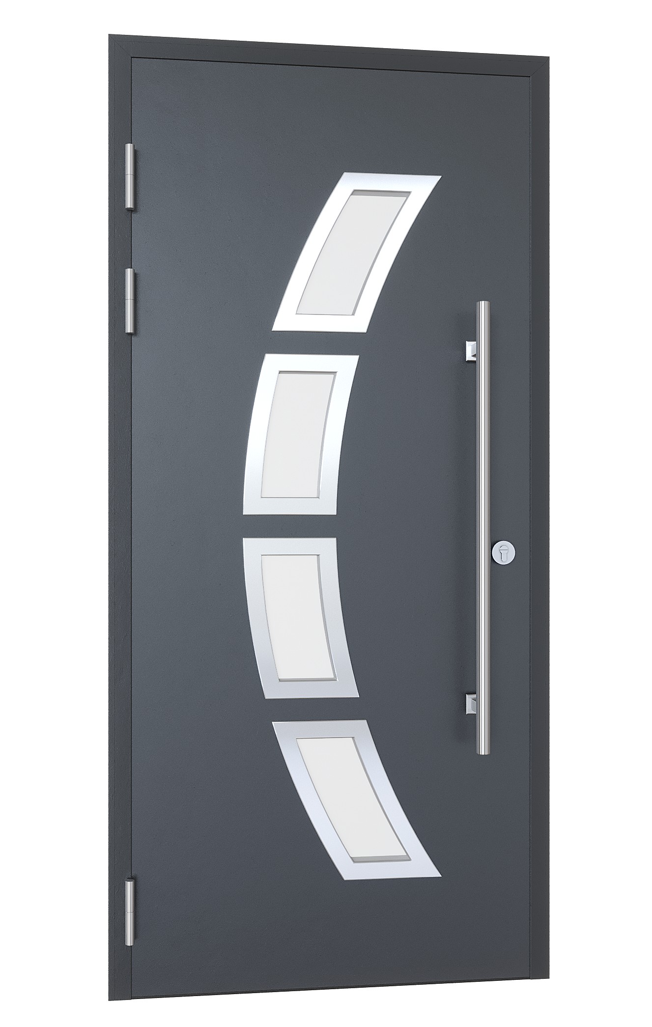 Входная дверь для частного дома с терморазрывом, фигурный стеклопакет с декоративной накладкой из нержавеющей стали, ручка-штанга 1000мм.