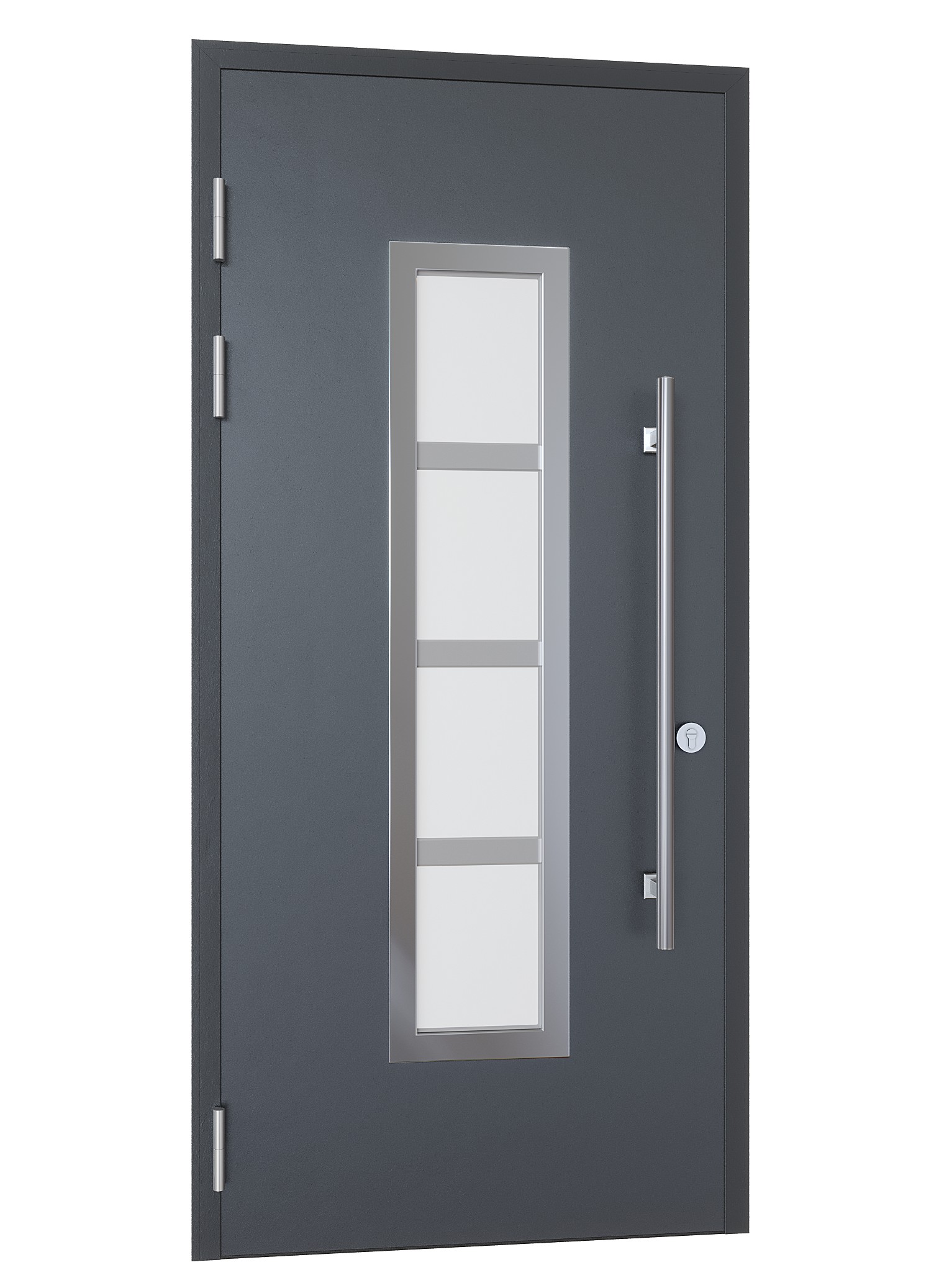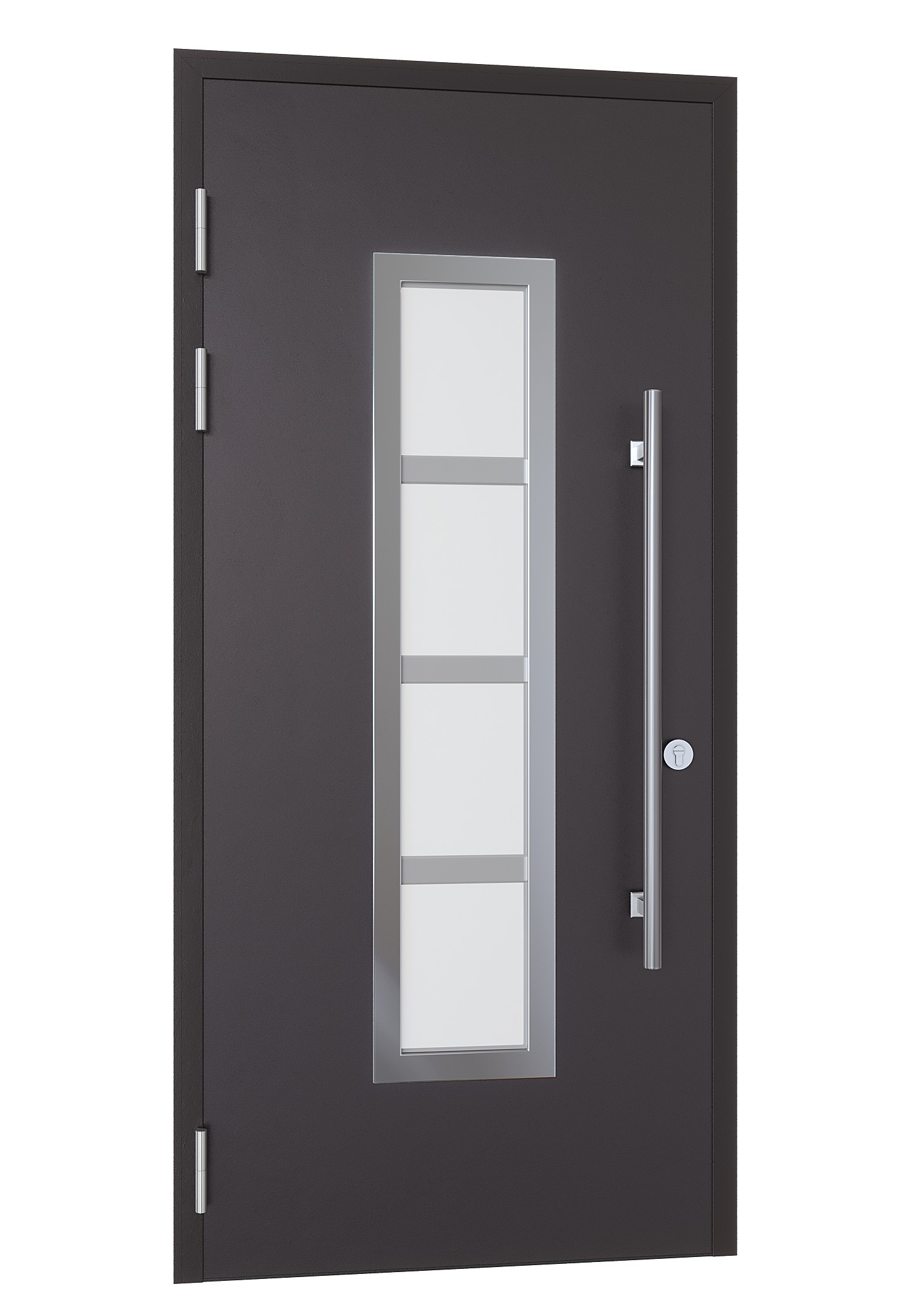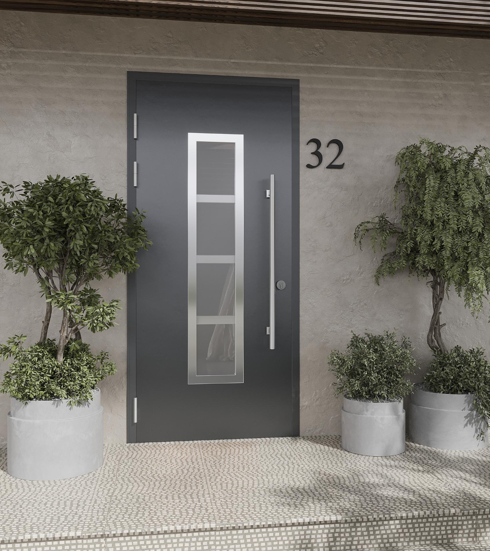 Входная дверь для частного дома с терморазрывом, матовый стеклопакет с накладкой из нержавеющей стали и ручка-штанга 1000мм.
