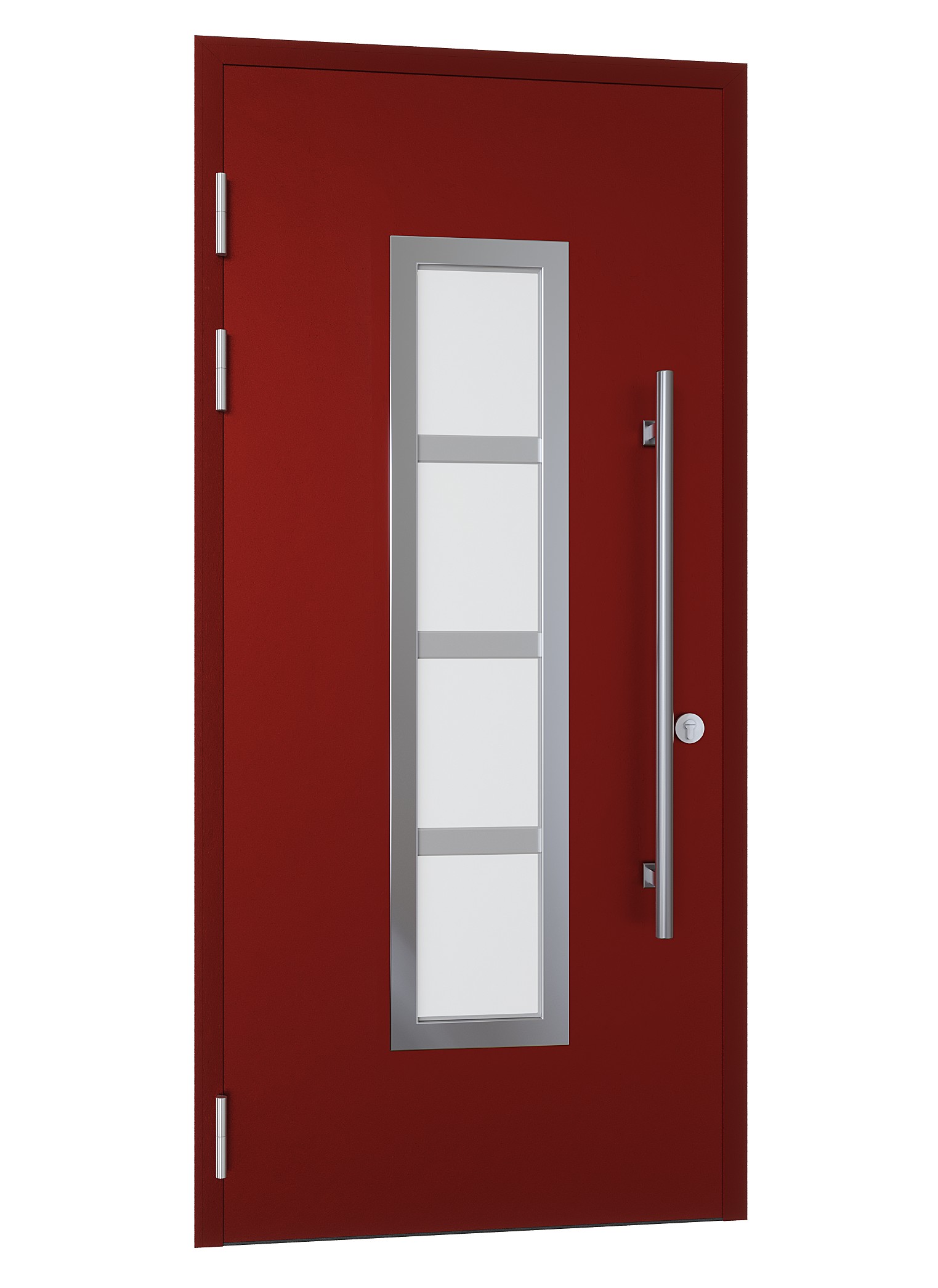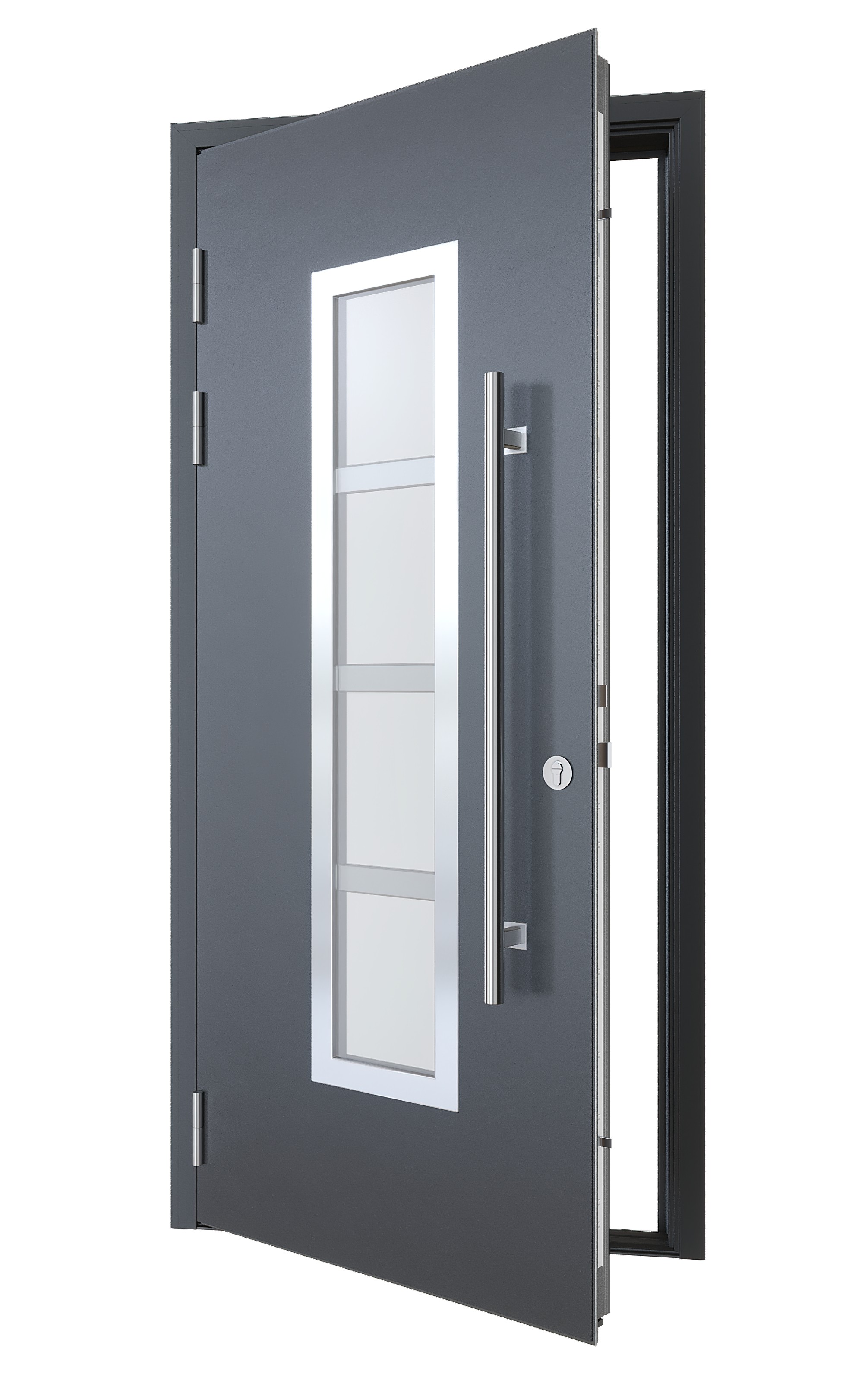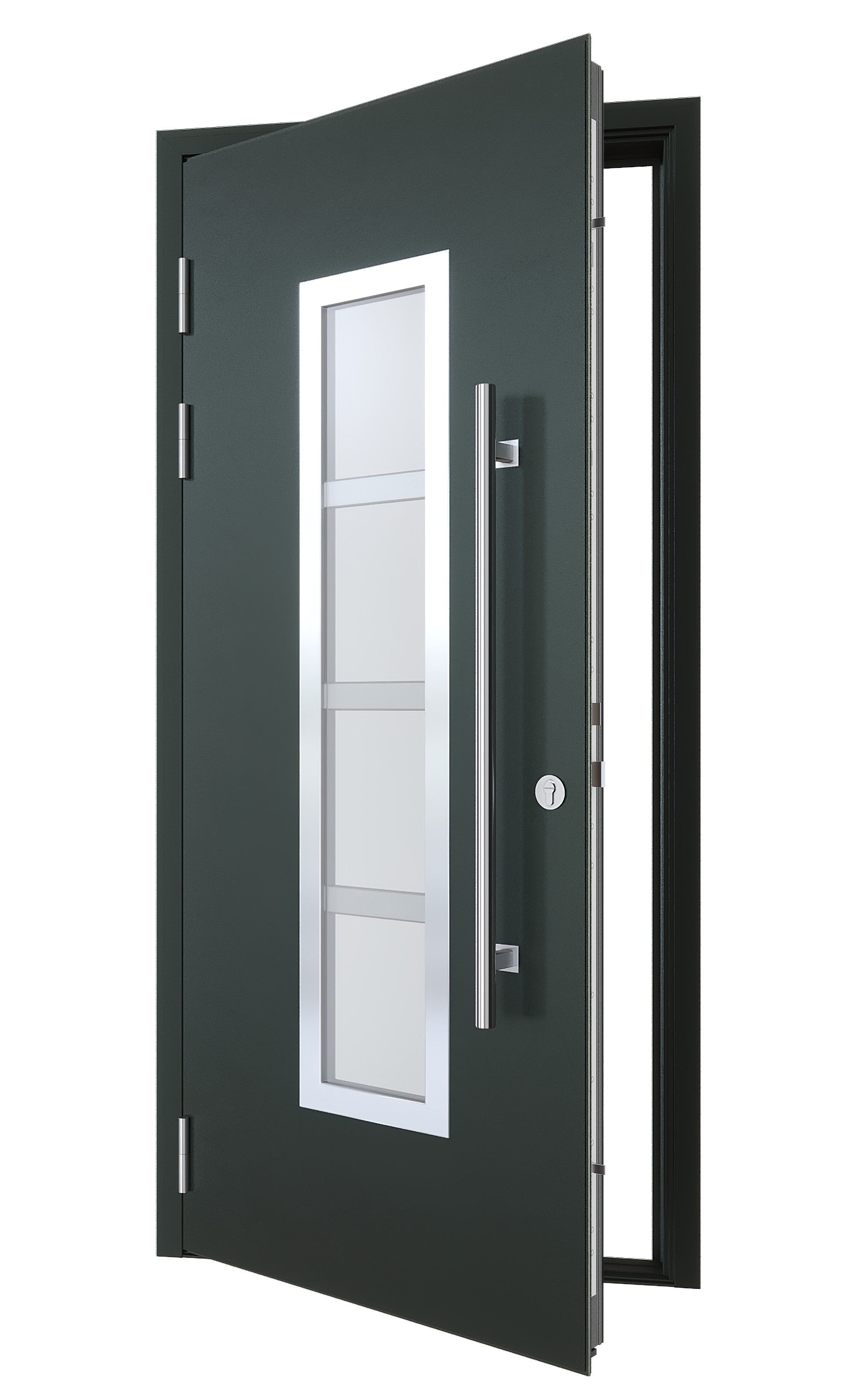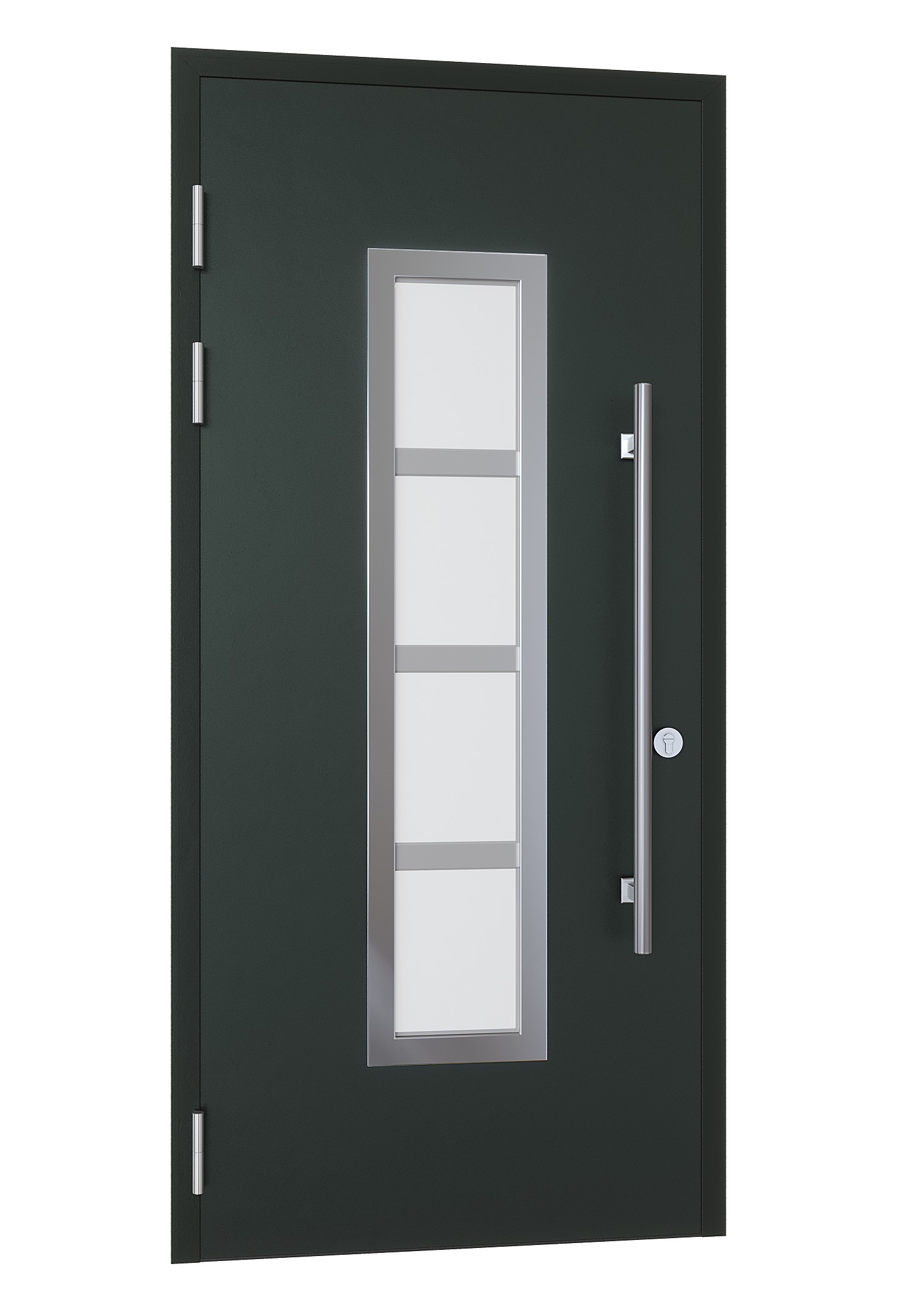 Входная дверь для частного дома с терморазрывом, матовый стеклопакет с накладкой из нержавеющей стали и ручка-штанга 1000мм.